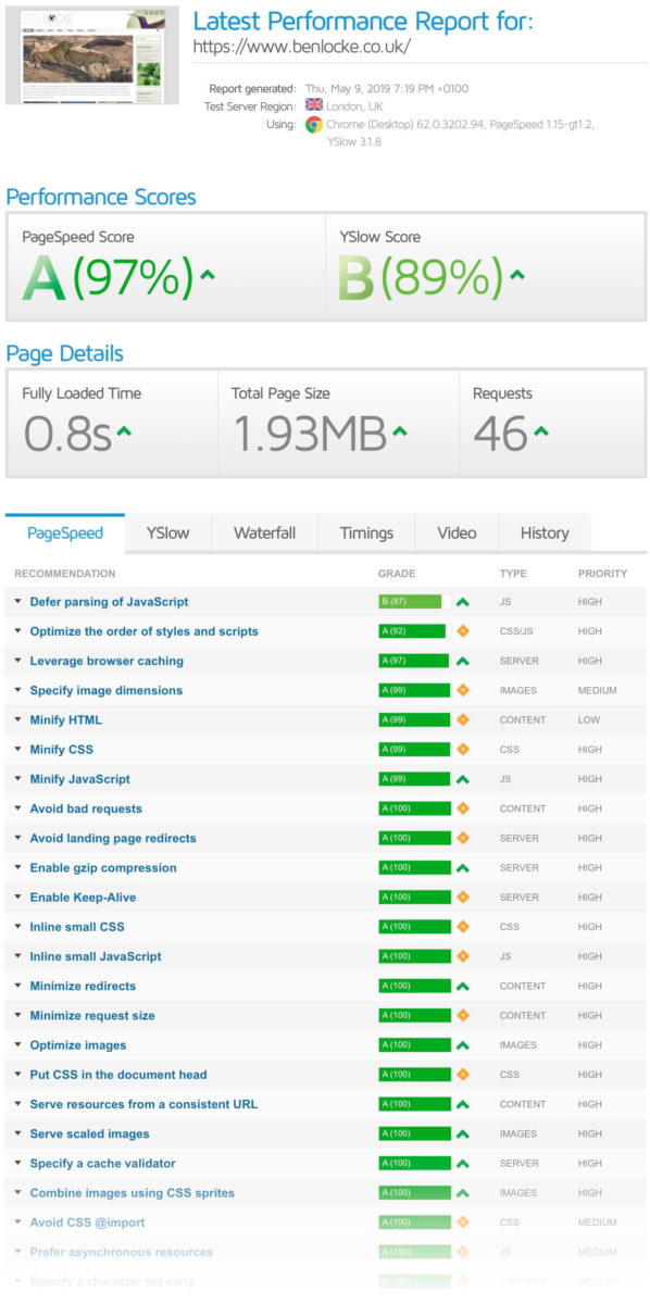 Optimisation of this site has been a big task. It always feels like you’ve finished once a site is built and functioning correctly, but as with any software development, proper testing takes time, and so does getting things running as smoothly as possible. I’ve been using GTMetrix as my main method of performance testing as they automate a lot of tests very quickly, and I can simulate different browsers, devices, geographical locations, etc. Along the way I’ve compressed all CSS, HTML and javascript, deferred whatever can be deferred until the page has actually rendered, losslessly optimised images, streamlined server-side and browser-side caching, enabled a distributed proxy server, and what seems like heaps more. I think I’ve gone as far as I can now. It’s reached the stage that optimising one thing for minor gains actually has adverse effects either of performance elsewhere, or worse, on the site layout or functionality. Despite the amount of images and the number of data accesses, etc happening on the home page, I’ve got the loading times down to <1 second. Striving for further gains seems pointless. I believe the site to currently be bug-free and working as quickly as it possibly can. Hopefully future posts in this section will only relate to site improvements and new functionality 🙂